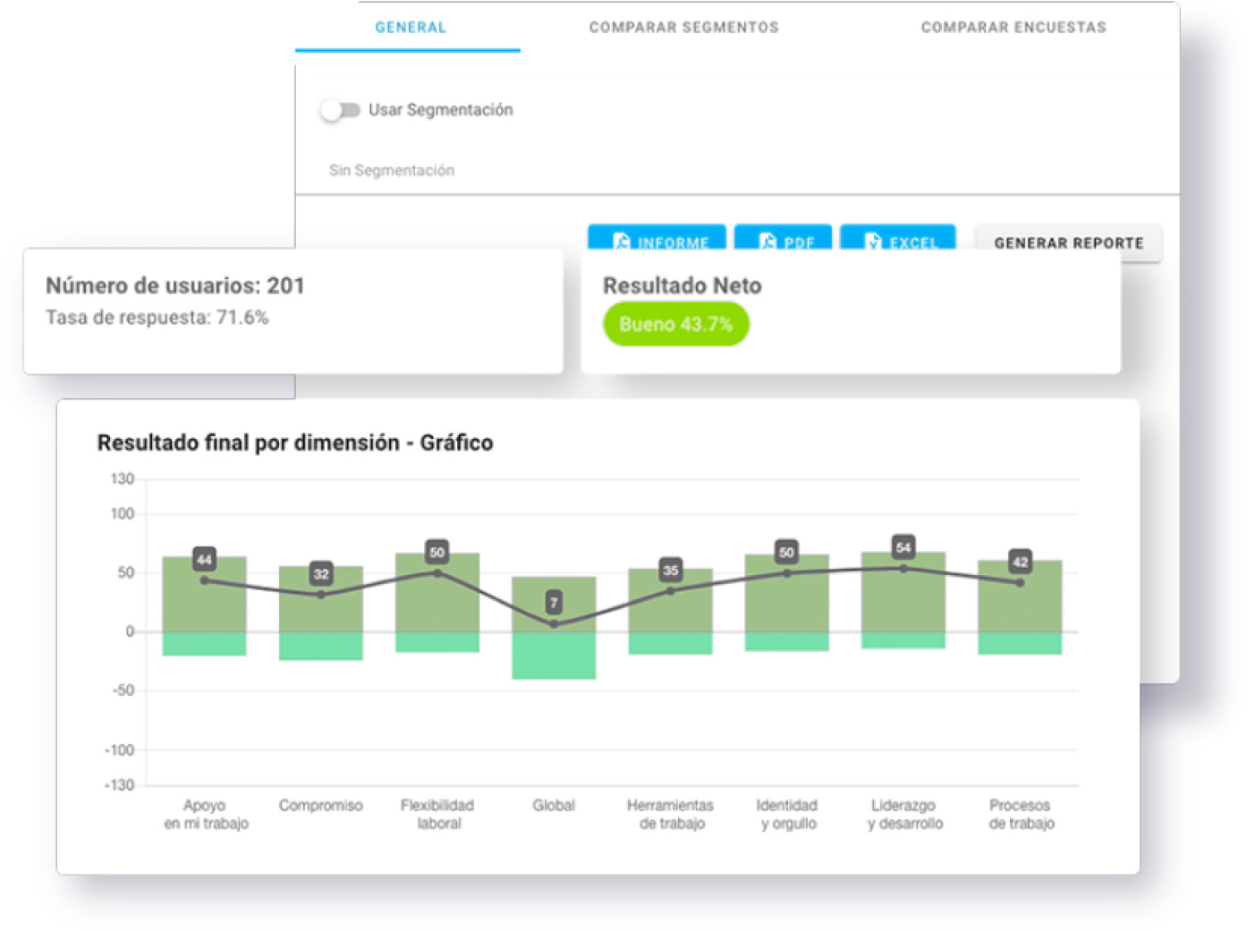 Módulos de clima y cultura organizacional: a través de encuestas de clima laboral, las empresas pueden identificar oportunidades de mejora y diseñar estrategias de compromiso basadas en datos reales.